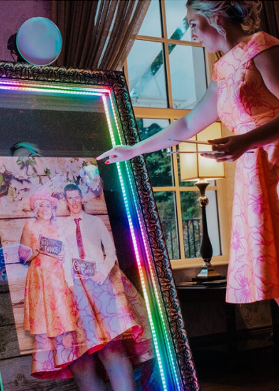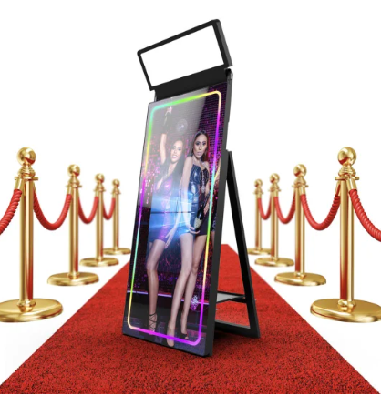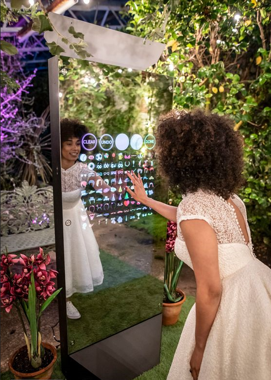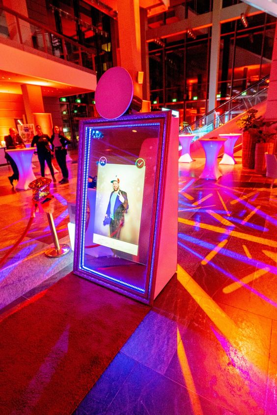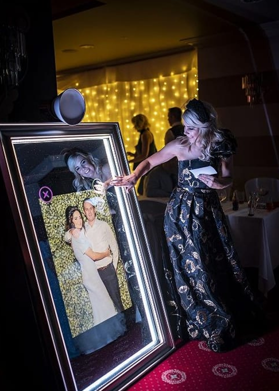 The surface of the mirror booth is reflective and touch-sensitive, displaying vibrant animations or prompts that invite guests to interact. It can offer compliments, countdowns before taking a photo, and fun instructions or games.